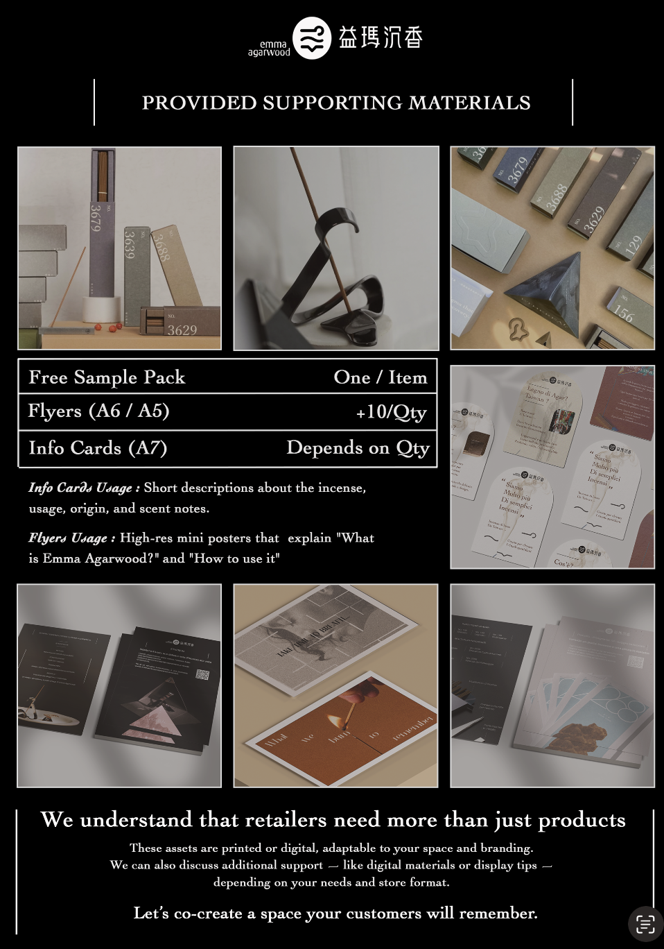 Goal: Present full incense range for B2B and Artistic collaboration purposes